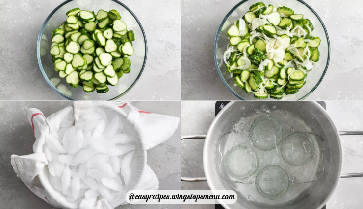 Place sliced cucumbers and onions in a large bowl. Sprinkle with pickling salt and toss gently to coat. Cover with ice or cold water and let sit for a few hours so the vegetables stay crisp and fresh.