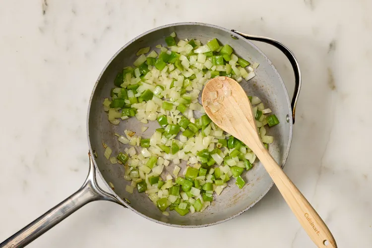 - Cook onion and bell pepper in oil until soft