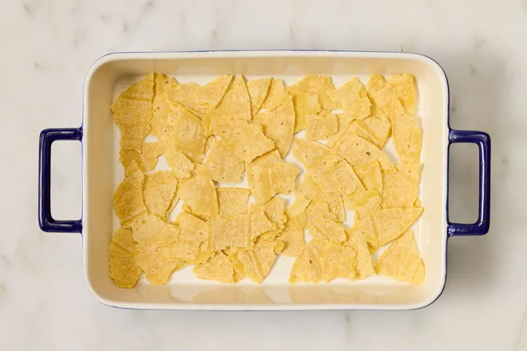 Add the shredded chicken into the sauce and mix well so it’s fully coated. In the baking dish, layer tortilla pieces, then spoon over the chicken mixture, followed by cheese. Repeat the layers until everything is used.